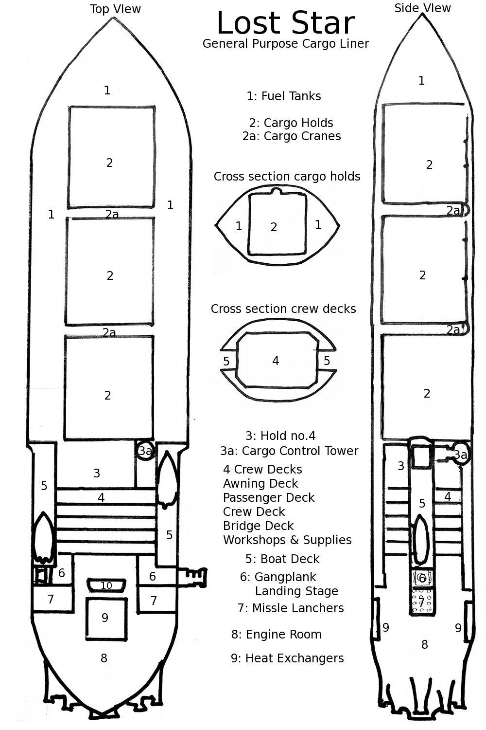 Below is a diagram of the Lost Star. I have no working knowledge of computer drafting, so this diagram is hand drawn, and rather crudely at that. Sorry. I made the Lost Star very utilitarian, a no-frills tramp space ship. The unexpected result of having a very plain ship, was that I found it impossible to come up with a cover illustration that was at all interesting using it. And I did try.