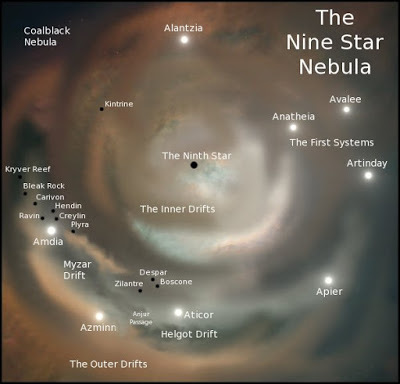The Nine Star NebulaBelow is a representation of the Nine Star Nebula, with its eight stars, major drifts and most of the drift worlds and stations. Volume One, The Captain of the Lost Star take place entirely in the Azminn solar system. Volume Two, The Enemies of the Lost Star takes them to the drift worlds of Zilantre, Boscone and Despar. Volume Three, The Ghosts of the Lost Star takes the Lost Star to the drift station of Plyra, then on to the Amdia solar system, and the various drift worlds and stations out to the Kryver Reef.