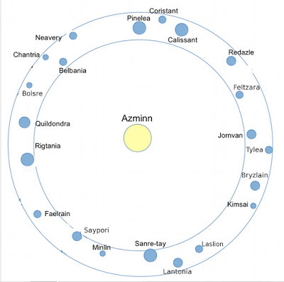 The Inhabitable Planetary Belt of AzminnBelow is a diagram of the Azminn solar system showing it's human inhibitable planetary belt and the relative position of the 21 planets that circle Azminn in this belt. (At the time of the story, relative positions shift over time.) The size of the planets are drawn to indicate importance & population rather than the actual size of the planets. The Captain of the Lost Star takes place entirely within this system.
