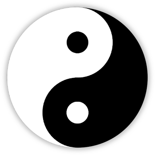 Yin and yang, usually symbolized by the circle above, can be thought of as a combination of opposite, but interconnected forces, that interact to form a dynamic system with the whole greater than the two parts. These forces are fluid, each with the seed (the little circle) of its opposite within it. The white "yang" is considered active, expansive, bright, open, and male, while the black "yin" is reactive, passive, dark, mysterious, and female. Everything has elements of both within them, in varying degrees, at various times.