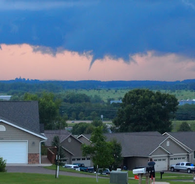 I haven't run across any photos of the tornado itself. I gather that it was "rain-wrapped", i.e. the funnel was in the midst of the rain & hail, so it couldn't be seen. So I didn't actually miss much had we still been living there. The good think is that only one person was injured, and of course a number of people were left homeless and lost a lot of their property. Still it could've been far worse.