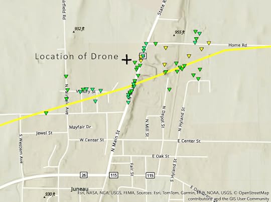 However, later that afternoon, a small F2 tornado with 120mph wind briefly touched down in Juneau Wisconsin, which is the town where we lived for over 30 years before we moved to Eau Claire six years ago. Below is the track of that tornado in relation to the little town. I have a couple of shots taken by the storm tracker's drone flying around where the "X" is on the map. All the little triangles are reports of various levels of damage. Most of the damage to the west (left) were trees down and windows broken. It was on the Main Street's north end where roofs were taken off and houses damaged.