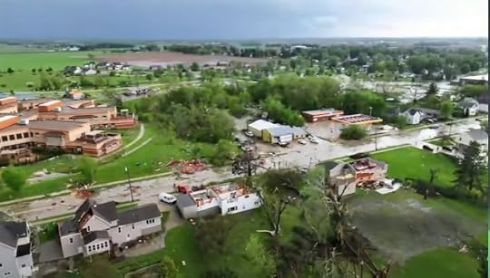 Below is a wider view (a screen shot, so the detail isn't very good) of the destruction along Main Street within half an hour of the tornado. There was a storm chaser following it and he sent up the drone. The big tan building is the nursing home. It lost a lot of windows. Beyond it was an ex-motel, now apartments which lost most of their roof, and the power line poles were down all along the road beyond.