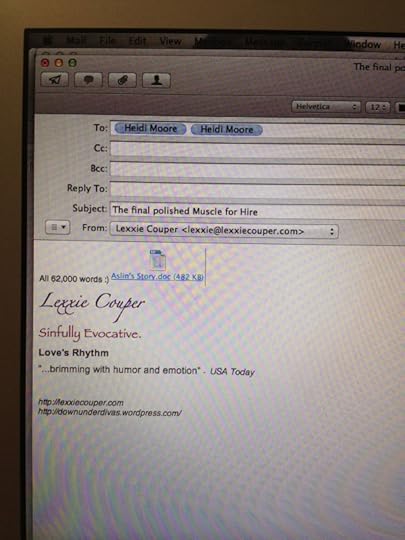 Muscle for Hire, Aslin Rhodes’ story, is on its way to my Samhain editor. My very first romantic suspense. Yay!