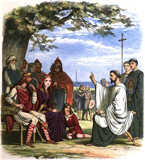 The king’s reeve, who had met them when they landed on the isle, had told them to wait on the king’s pleasure but they had learned, while waiting for Æthelberht to arrive, that the king feared meeting this group of monks from far away under a roof lest they cast a spell upon him. Apparently the open air was safer so far as magic was concerned. So, with his cloak wrapped tight round his shoulders – did the wind never stop in this country? – Augustine waited on the king’s arrival.