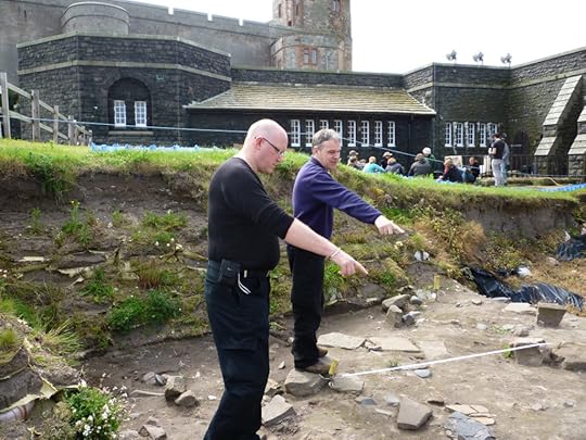 Paul Gething and Graeme Young, directors of the Bamburgh Research Project, inspecting finds in one of the trenches in Bamburgh Castle