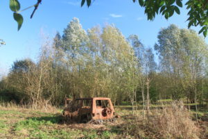 The Colne Valley Way branches off from the King George VI Reservoir and muddily passes land that is slowly returning to carr, as young alder and willow form dense thickets in the permanently wet ground – watch for the mouldering Land Rover, turned glorious russet by rust.