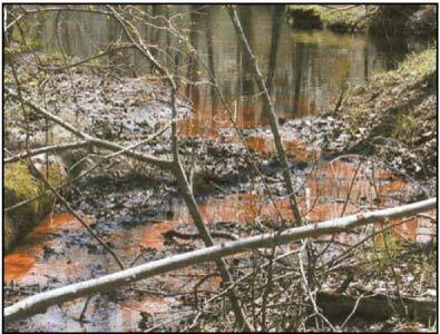 An extrusion of red-orange mud by a stream leaks what appears to be oil or petrol into the water, producing an orange sludge in the bottom of the stream and a reflective and refractive scum on top of the water.