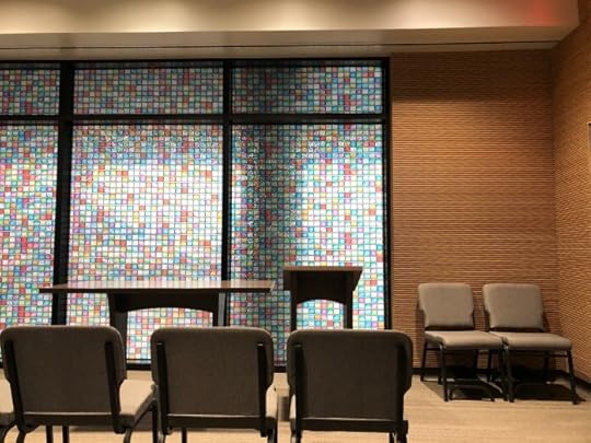 Doing so, this trip I stumbled upon an interfaith chapel at one end of Terminal D. It looks like the waiting room–heaven or hell?–in a science fiction movie with an anodyne “stained glass” window, beige carpet and a loudly ticking clock. I couldn’t have been more grateful or happier. The good folks who run it out of the kindness of their hearts have even installed a couple of free showers, just in case you need a shower.