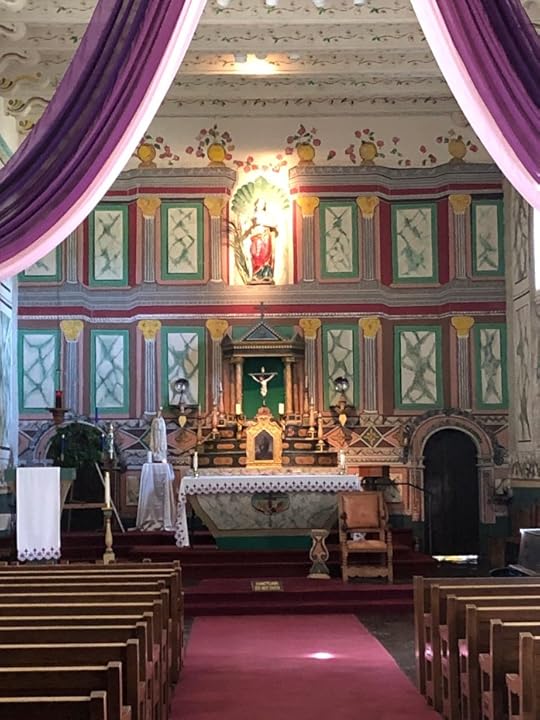 I stopped this time in Solvang which is a dreadfully crowded fake Danish village on the far end of which is the beautiful Mission Santa Inés. I’d visited once before several years ago and it was lovely both times though probably a bit noisier and the gift shop wasn’t as good. No matter. The courtyard was full of roses, echeviera, sea lavendar…California flora that is so familiar and so dear and that you don’t see much of in Tucson.
