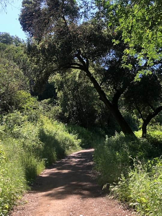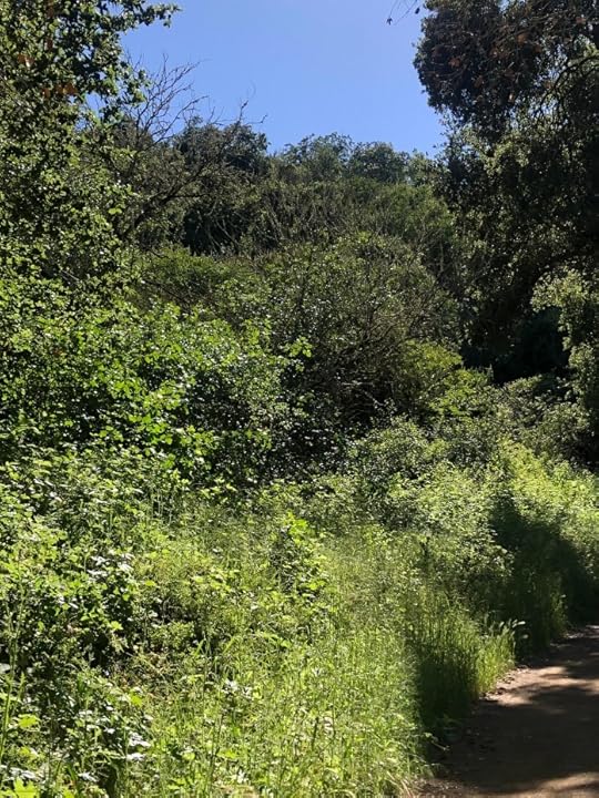 Directly across the Cristo Rey Drive lies the 4000-acre Rancho San Antonio Open Space Preserve, which contains 24 miles of trails: gorgeous wide trails of soft dirt that wind beneath towering stands of live oak, bay, and sycamore; that at times parallel gurgling streams and brooks; that are lined with all manner of blooming trees, shrubs, herbs, and wildflowers; and in many places are devoid-ish of people. I have made my way over each day and walked, 5, 6, yesterday 7 miles.