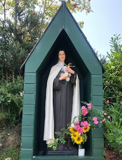 ST THÈRÈSE OF LISIEUX, UP AGAINST THE BLEATING LAMBS IN BACK OF ST. KEVIN’S CHURCH. NOTE THE LOVINGLY-TRAINED RAMBLING ROSE.