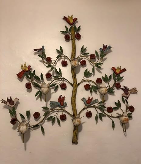 My newest purchase is a vintage, caked-with-grime, metal 5″x5′ folk art item called a TREE OF LIFE, featuring branches for five fat candles. It is festooned with birds, and the other day, after hosing off and scrubbing, I managed to mount the thing on my bedroom wall, filling in the giant holes left by the previous tenant for THEIR art with toothpaste.