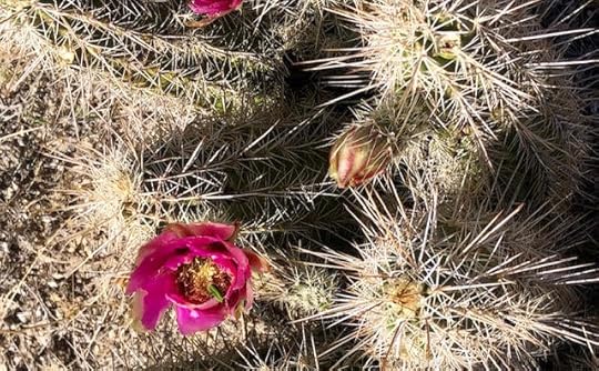The prickly pear and cholla cacti are also in bloom, many shades of deep red, magenta, cantaloupe. Also mallow: apricot, deep pink, seashell pink.