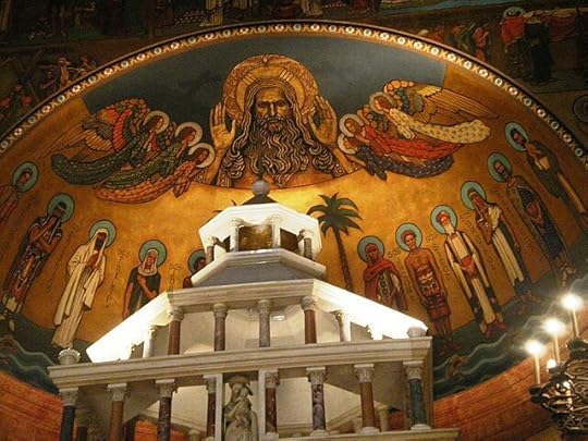 MURAL ON CEILING ABOVE ALTAR, ST. ANDREW’S CHURCH, PASADENA(Light) chores at my current place include chicken feeding. That’s right. I give them a large scoop of feed mixed with a pinch of oyster shells, and a bowl of special fermented “mash,” and pray they don’t peck at me. I’m also in charge of a salamander.