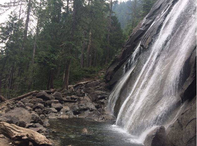 Choosing a hike also proves challenging. We hope to escape the forest fire smoke by heading north from Seattle, then east on Highway 2. In Gold Bar we stop to reconsider. The smoke is hanging high, so we decide to avoid elevation and nix our plan for Heybrook Ridge given the view will be nominal. Instead, we head for Bridal Veil Falls, a hike I’ve never done despite a lifetime in the region.