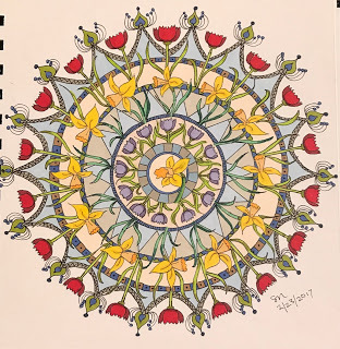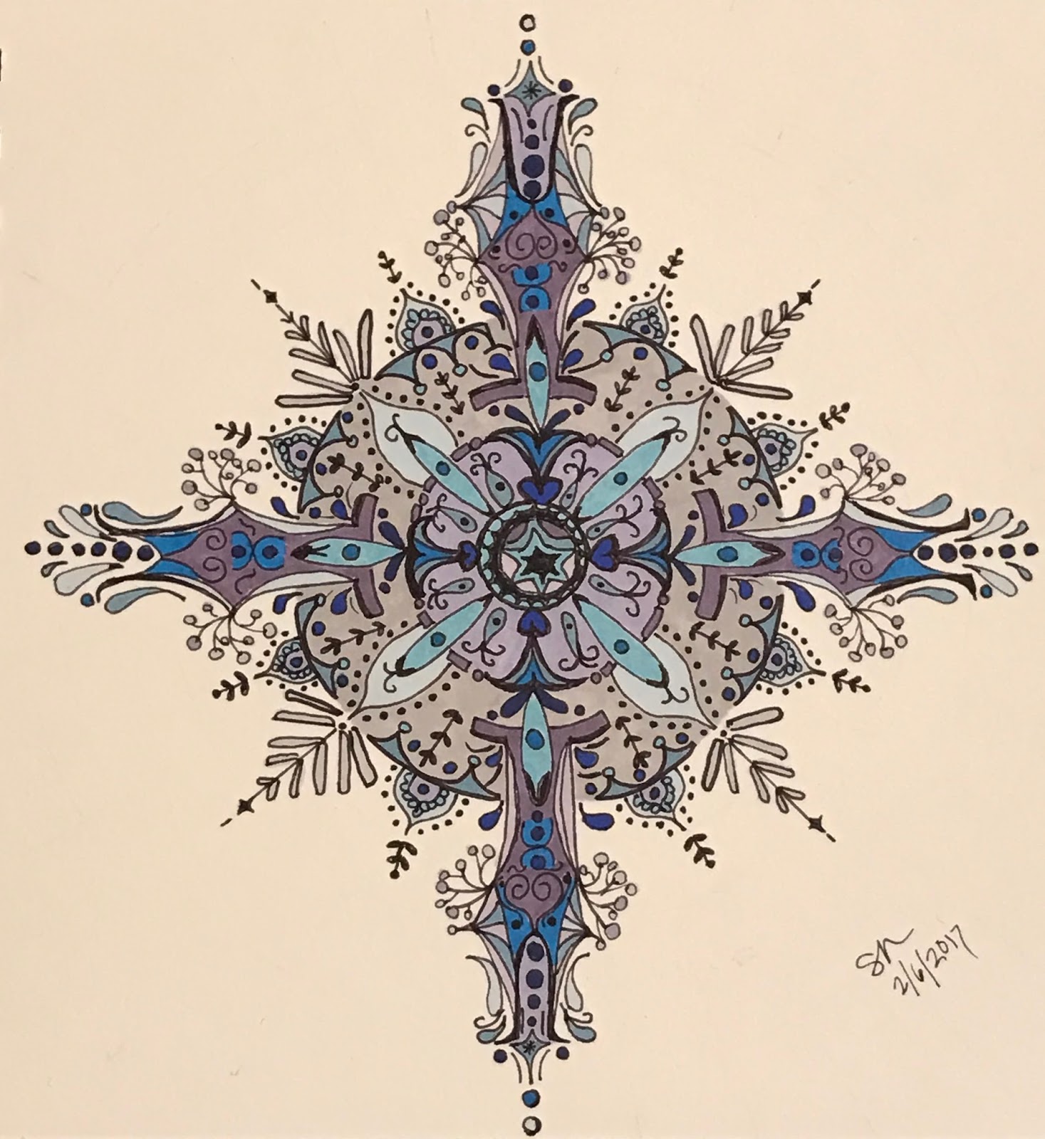 And then, four months ago, I discovered that those weren’t my problems after all. A friend wrote about drawing mandalas as a form of meditation on her blog. I took the online class that she referred to for no other purpose than to relax. It was Inauguration Day and I needed something to do with my hands while obsessively watching cable news. I learned that drawing mandalas has been a meditative practice in many cultures over thousands of years. It does not require any particular talent for drawing. The technique is formulaic – and once you learn the basics, you simply start in the center and make it up as you go. A more disciplined form of doodling, really.