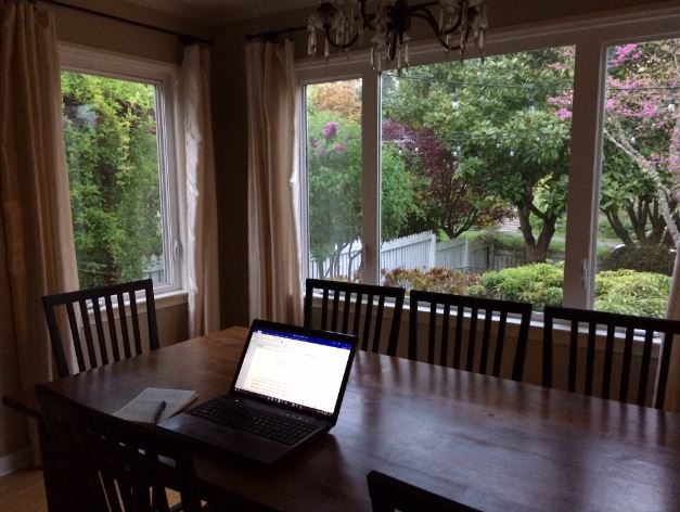 I could not function at this desk. Could you?I love to write, type, read, edit at our large dining room table, at times alone, other times with my writing partner at my side. I love the openness of the space, the living room to the right, windows to left, front, right. I love the wide view of front yard before me, leafy green trees, red table umbrella, jasmine-laden picket fence, street and neighboring houses almost hidden behind our green curtain. Even in gray rain, even in leafless winter, still I love to work at this table.