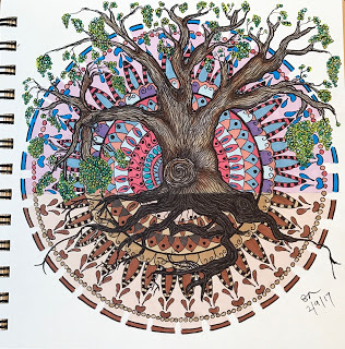 (Mandala #10) I had an idea - what if the knot in a tree was the center circle in a mandala? That idea grew into this. Mandalas literally do grow. Starting in the center and growing into whatever it decides to be. Every time - and especially true on this one - from about 20% in the process through maybe 60%, I am quite certain that I've ruined it. Nevertheless, I persist, and the end result is always indeed worth finishing. Not ruined after all. This is such a rewarding art form. And a great life practice of not giving up. I encourage everyone to give it a try.By Mandala #18, I was fully committed to incorporating drawn objects in the mandalas. The early pattern mandalas were great for starting out. I needed structure and techniques to guide me. But as I followed the muse, mandala after mandala, I felt like I was creating something new. They were much more personal pieces – pictures and stories that meant something to me. This was no longer a traditional mandala. Maybe it’s not even a mandala anymore. It doesn’t matter. My art. My rules.