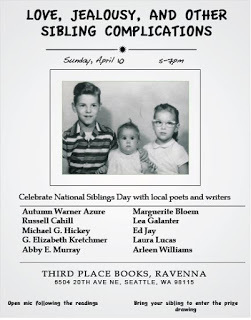 Thanks to Third Place Books ~ Ravenna for hosting the National Siblings Day reading last night. My first public reading - at open mic - was here in 2003. What a pleasure to return to such a welcoming venue.Thanks to the talented G. Elizabeth Kretchmer for organizing the event and keeping us on track throughout the evening with her warm humor. Check out her books. Write a review. Make an author happy.