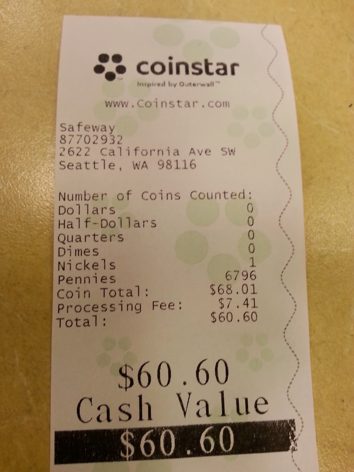 In a task my back muscles whine about the following day, I heft the penny jar to a chair and tip it empty to the floor. The pennies fill two gallon-sized freezer bags. I settle them into a fabric grocery bag, but the weight is more than I can carry out to my car. I hear Dad reminding me of the dangers of "a lazy man's load" and make two trips to the car. In the supermarket parking lot I load the pennies into a shopping cart and head to the green Coinstar machine at the front of the store. "Out of Order." I push the cart back out to my car, cursing under my breath. At supermarket number two, I'm smarter. I walk in without Dad's pennies to check that the machine is in working order. Then back out to the car with a shopping cart to haul in my load. And there the racket begins.