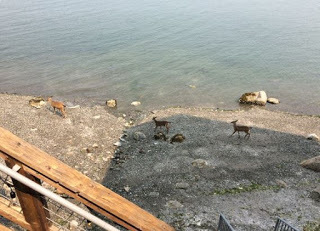 Light traffic and a ferry allowed an early arrival. I wandered the small town and dock, ate at the hotdog stand, and gawked at the deer and fawns on the beach.