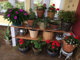 By mid October, classes were settling, and it was time to winterize the garden. I’ve had a board and brick bookcase since the early 1980s. It was in my work office for close to thirty years until the building was torn down and I landed in a much smaller space. We re-purposed a few of the boards and bricks and brought in the potted plants for an indoor garden. Blooms blur seasonal change.