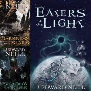 And I would answer that I’ve very recently finished up my big fiction trilogy – Eaters of the Light. Each cover was created by Amanda Makepeace, whose interview introduced me to you. This series will appeal to lovers of both fantasy AND sci-fi. Space vampires, holographic blue girls, and intergalactic heartbreak. It’s available now on Amazon.