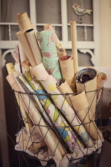 photo credit: Zipporah LomaxRolls of wallpaper and wrapping paper hang out in a large vintage basket.