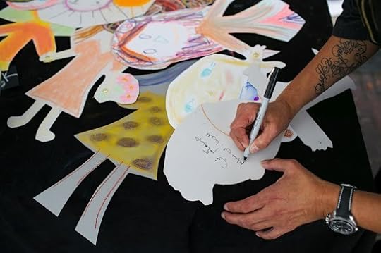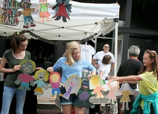 The Mission: Connect kids in American with kids in the Middle East and to create a fun and imaginative project for the Syrian refugee children, most of whom cannot attend school. I held an art workshop on the streets of Seattle showing children and grown ups how to make a large paper doll chain of their drawings. Everyone wrote notes of encouragement on the backs of the dolls like "We are thinking of you and send our love."