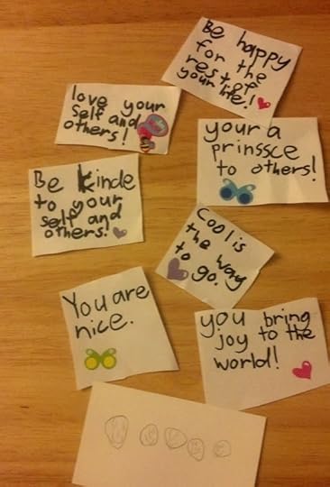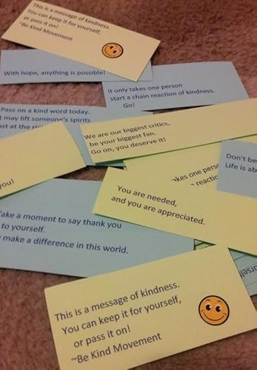 The Mission: I came up with about 6 sayings, printed them up on pretty paper. The back reads 'Keep it for yourself or pass it on.' My two daughters helped put stickers on every one of them. I've been placing them anonymously at work and random places like the bathroom stalls and by the copier. I have a fellow co-worker that I've pulled into the mission as well! While grocery shopping my daughters and I place them all around the grocery store. They think it's neat that no one can know we are the ones doing it!! My daughters loved our first missions so much they are now creating and leaving their own notes.