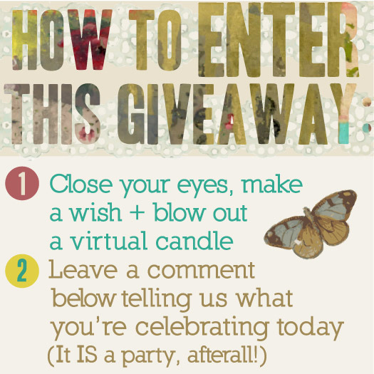 HOW THIS WORKS: Read through all that is being given away (major goodness). Then simply leave a comment at the end of this post to enter the drawing (32 winners!). Tell us what you're celebrating (it is a party, after all!). Please enter just one comment. Comments will be closed Friday morning. We'll randomly select the 32 winners and announce them Friday afternoon.