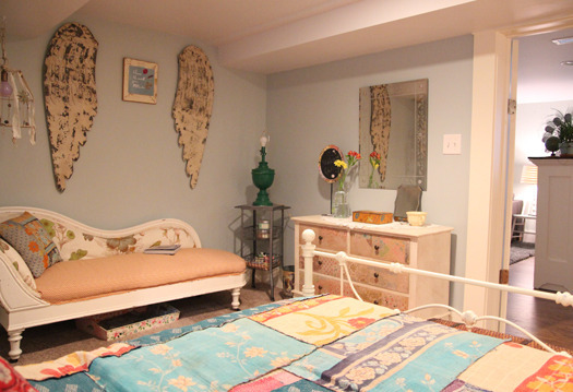 (Wings are from Creative Co-op, dresser is from my home decor line with Creative Co-op, and chaise is a hand-me-down)These aren't the very best photos, but it shows the progress of our newly remodeled guest room! I love love love this room and I find myself here often, working on the chaise, playing on the bed with True, or getting some quiet time. This project has a been a couple of years in the making and so glad to be enjoying it now! With the completion of this room our little two bedroom bungalow has managed to squeeze in four bedrooms which friends, feels like a whole lotta space. Grateful, indeed.