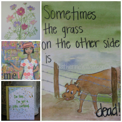 GIVEAWAY: One person will receive an 8x10 watercolor of Cosmos. One person will receive an 11x14 collage print of Pink Hat Girl. One person will receive a set of 5 I'm Fine notecards. One person will receive an 8x10 watercolor of Grass is Always Greener from Catherine Williamson of Catherine's Colors.