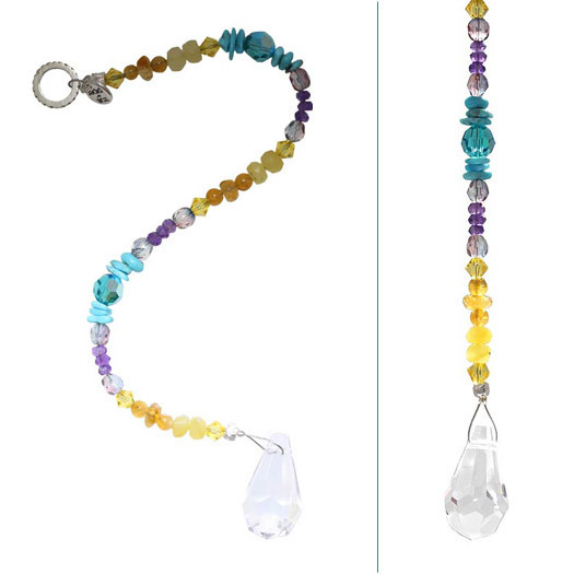 Add some cheerful light and color to any space with our gemstone crystal prism! Turquoise, amethyst and citrine are blended for a great color combination to accent the teardrop shaped prism. Faceted crystal balls or prisms split beams of light and radiate the light to all areas of the space, bringing harmony and peace into your life. Prisms are also a very popular contemporary feng shui cure. Held up to a sunny window or other light source, a multitude of tiny "rainbows" will fill the room. Each little rainbow contains all the colors of the visible spectrum, bringing both vitality and balance to the room. Beautiful!