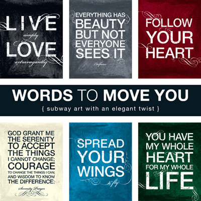ABOUT: As a book designer and artist, I have combined those skills into creating works of art by illustrating typography. Utilizing layers of rich textures combined with powerful quotes, I have named my line “Words to Move You” as it is my hope that they do exactly that: move your heart to motivate you to live your life to the fullest.