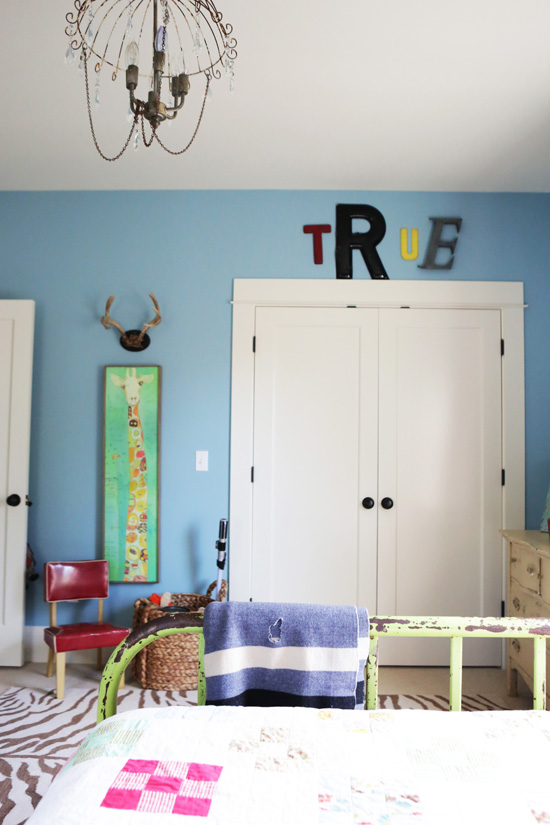 We painted the walls True's favorite color (specifically Marlboro Blue by Benji Moore paint). We also brought over one of our favorite vintage light fixtures from the old house. We love it here in this space. For toy storage, we use the closet, the dresser, baskets under the bed, and baskets throughout the room. Simple and perfect.