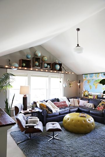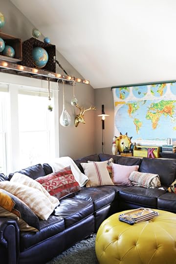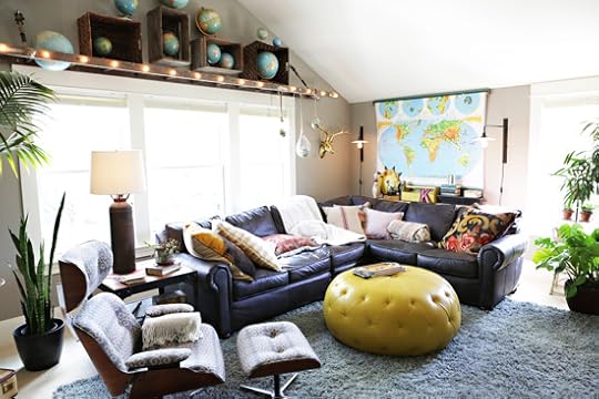 The big yellow pouf came from Schoolhouse Electric - another fave Portland spot. True loves jumping, singing, and sliding off of it. It's hard to see here, but to the right of the couch is a corner filled with large plants. We put a ton of plants in this room, which makes me wildly happy and goes along with our treehouse feel.