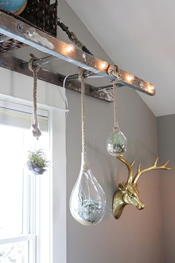 I created some hanging terrariums with some soil, rocks, and air plants and hung them from the ladder. LOVE! And the metallic deer is from Home Goods.