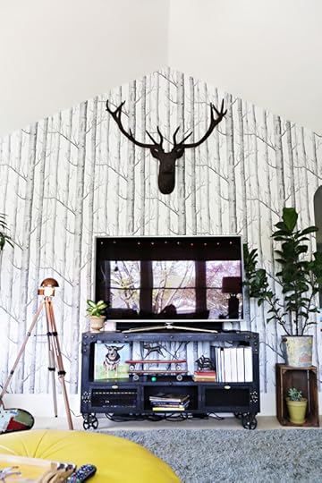 The wallpaper!!!! We chose to accent the TV wall with this iconic wallpaper to keep the tree house fort feel and I'm so happy with it. The TV stand is made by a papa/son duo here in Portland. The giant stag above the TV is also from Restoration Hardware.