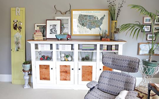 My dad also made this storage piece. We used it as a room divider in our old house (in the basement). I love it in this space. It holds games, videos, and more.