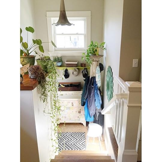 Today I'm fluffing the house a bit. I enjoy the meditative chores of picking up, watering plants, loving on each room. This is our mudroom. Once upon a time I painted and collaged that dresser. And once upon a time we converted a huge wooden column into a coat rack. Today I'm loving how the plant overflows. Makes me so happy.