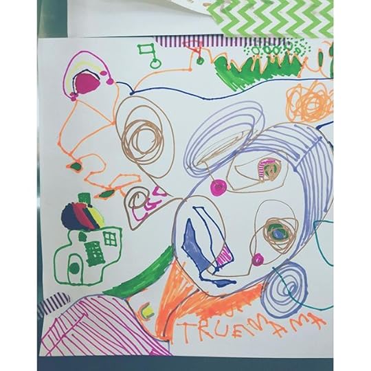 True and I have been collaborative drawing. I love doing this with him. We make a bunch of random marks and then we we see if we can find anything that we can make into something that resembles something else. In this one I created a figure around some marks that he made that we both thought looked like eyes. He also made a golf course in this one, a rainbow, and a house with a colorful roof. Love creating and learning from him. Go True go!