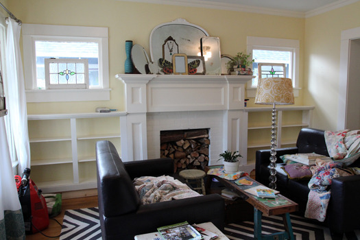 (bookshelves going up!)We put in some built-in bookshelves, which was a good move. A very good move. Made the room look wider, grander. Also gave us some space to add in some charming personality with our books and meaningful trinkets.