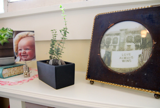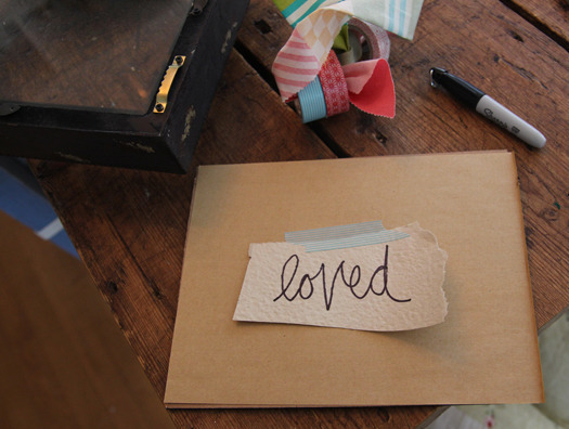 Next up: Instead of photos, insert hand written words that spell out a statement. For this one, I simply wrote one word per photo frame. I used a sharpie to write the words on torn sheets of old paper. I then taped them to the cardboard that was already in the frame (placeholders for photos) with washi tape.