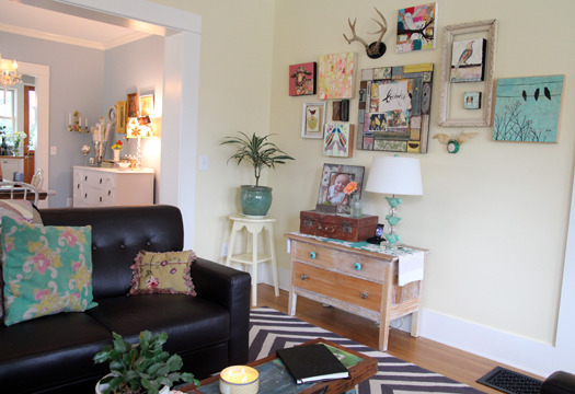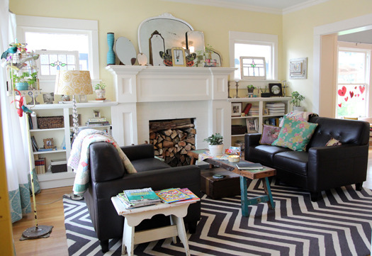 (Love how you can see True's construction paper hearts in the adjacent room)Another big move we made (besides scoring a chevron rug on overstock.com) was to get rid of our one big couch and replace it with two small loveseats. Best move ever. It allowed us to anchor the room with the couches instead of a wall and it also allowed the room to be what it really wanted to be: sort of skinny and long. Result? LOVE!