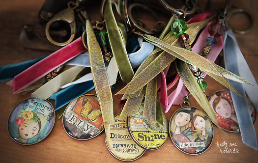 Can I just say how highly delightful these key chains are! Loving the double-sided medallions. Loving the mix of ribbons. Loving how they look clipped onto tote bags, purses, and backpacks - the tiniest bit of artful love. Collect all six, friends (perfect gifts).