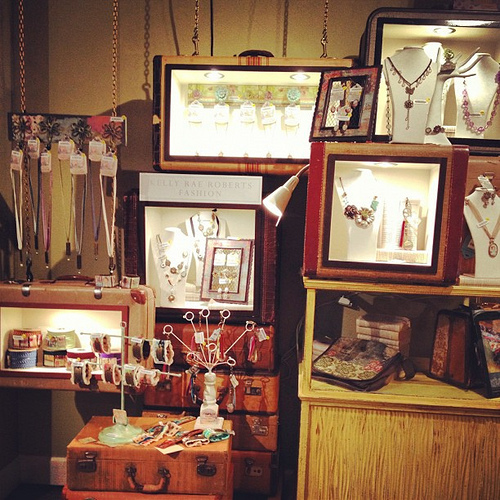There was also a magnificent jewelry display with some pretty awesome vintage suitcases repurposed as display cases with lights. LOVE. These photos aren't the best, but you'll get the idea: