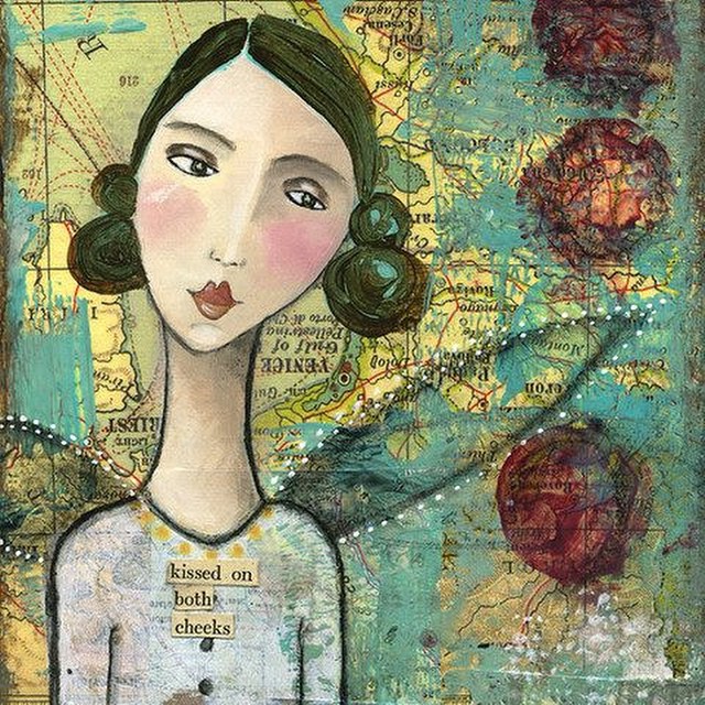 Kissed on both cheeks... One of my older paintings. The map collage makes me think of adventure and exploring! I know I just returned from a couple, definitely taking a breather on travel for now, but maybe another is right around the corner?