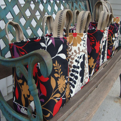 I am drawn to different fabrics and ideas by color and texture. I love working with and combining various prints and colors. All my coffee totes are made from recycled burlap coffee sacks. Many of my bags are repurposed from various upholstery remnants.